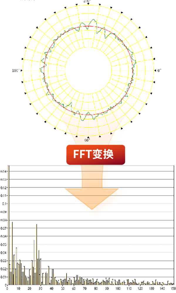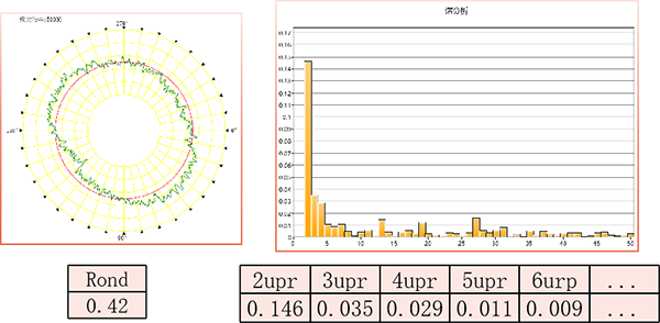 采用半径测量法,以精密转轴为测量基准。使用精密位移传感器和角向传感器获取被测件的圆轮廓数据,经快速傅立叶(FFT)变换成频域信号,得出每一单一频率(UPR)的幅值。如图: